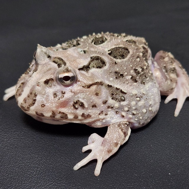 【基本情報】 種類:クランウェルツノガエル サイズ:約7cm 写真の個体をお送り致します。 【飼育環境】 底材:赤玉土小粒やウールマット、抗菌ではないスポンジ等 当店では湿らせた赤玉土をおすすめ致します。 お腹から給水するため、身体が浸かれるくらいの水いれも用意してください。 【給餌情報】 現在与えている餌:人工餌(当店のかえるのごはん) 給餌方法:ピンセット、楊子等 給餌間隔:1週間に2回程度 【注意事項】 生体につき、体色・模様・サイズに若干の個体差があります。 発送前に最終健康チェックを行いますが、輸送中のストレス等による体調変化は保証できません。 生体の性別や長期飼育の可否は確定ではありません。ご了承ください。 初めての方は事前に飼育方法をご確認ください。 飼育方法のご相談承ります。 死着保証はしておりませんので、ご了承ください。 【発送について】 発送可能地域:国内であれば原則可能です。(気温により制限あり) 発送方法:ゆうパック 発泡スチロールでの発送です。 気温によってカイロ/保冷剤使用致します。 発送日:月曜日着は、イベント出店の関係上ご希望に添えない場合がありますので、ご了承ください。